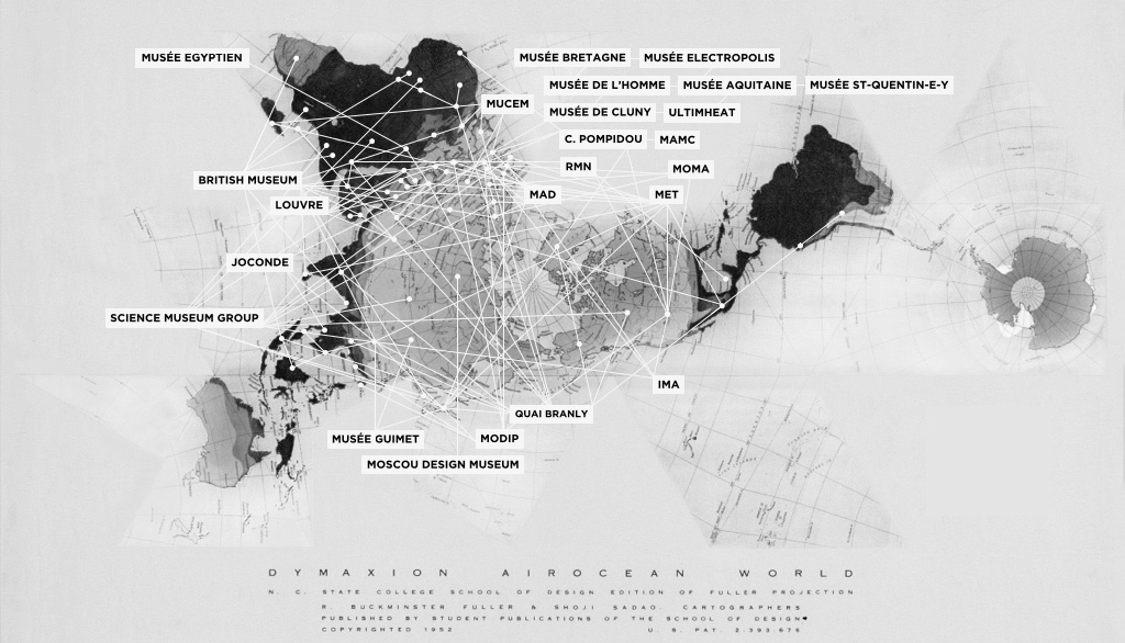 Dans chaque partie, on retrouve une iconographie des objets collectés. Chaque objet possède une description précisant au possible, ses matériaux, son nom, sa marque, son designer, son année et son pays. Voici ici leur mise en cartographie, avec l’exemple des cafetières, les objets sont organisés sur l’axe horizontale selon une généalogie rudimentaire, de l’objet mono-matière fait à la main (à gauche) à celui aux multiples composants industriels (à droite).